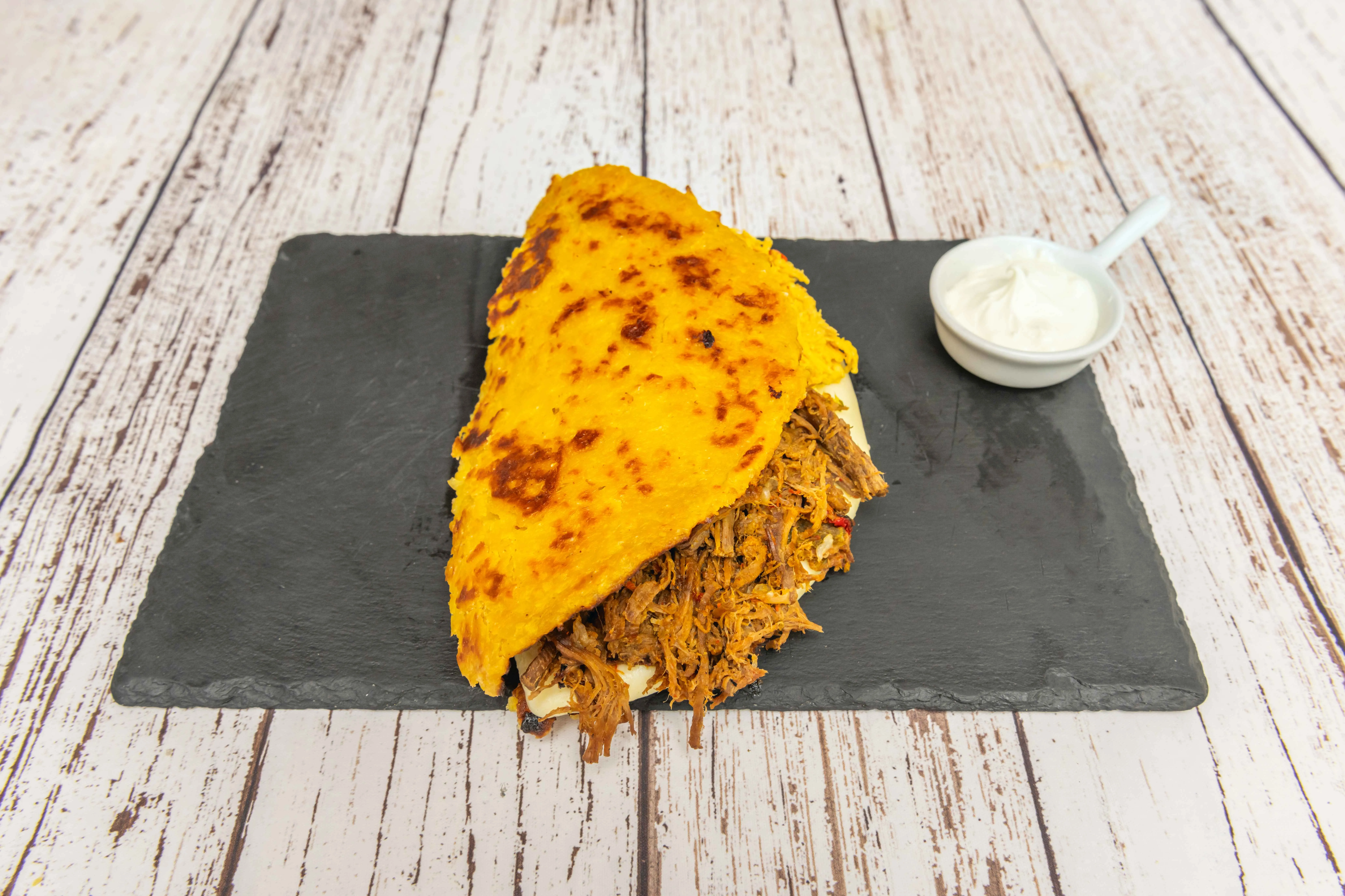 Sweet Corn Pancake Served With Queso De Mano (Fresh Venezuelan Cheese), Shredded Cheese, And Cream.